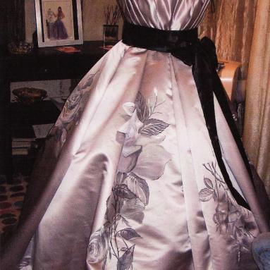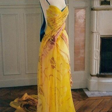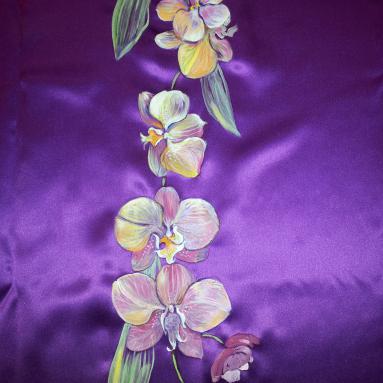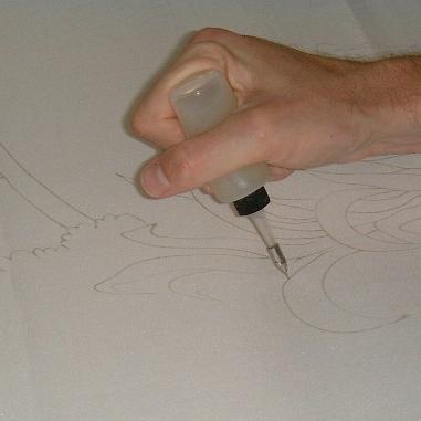 Les motifs sont dessinés à la gutta (sorte de caoutchouc liquide) du premier jet à main levée sur la soie tendue. L'exercice ne tolère aucun repentir.