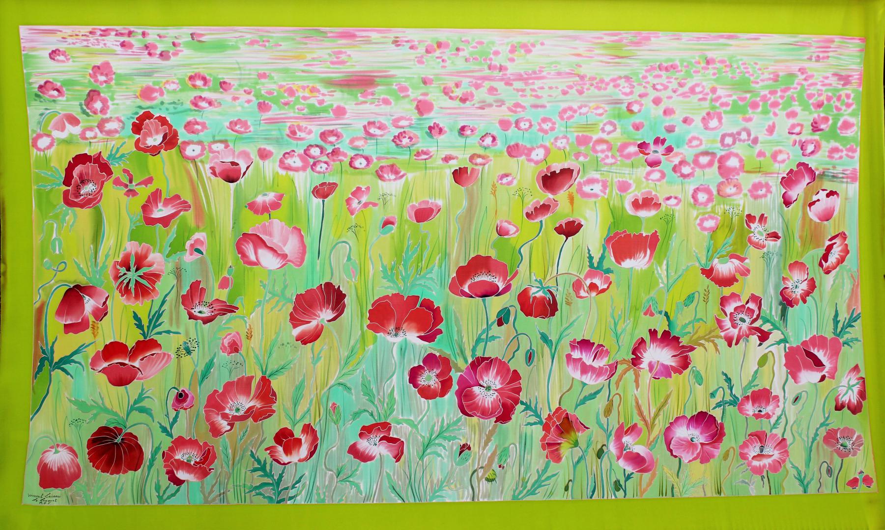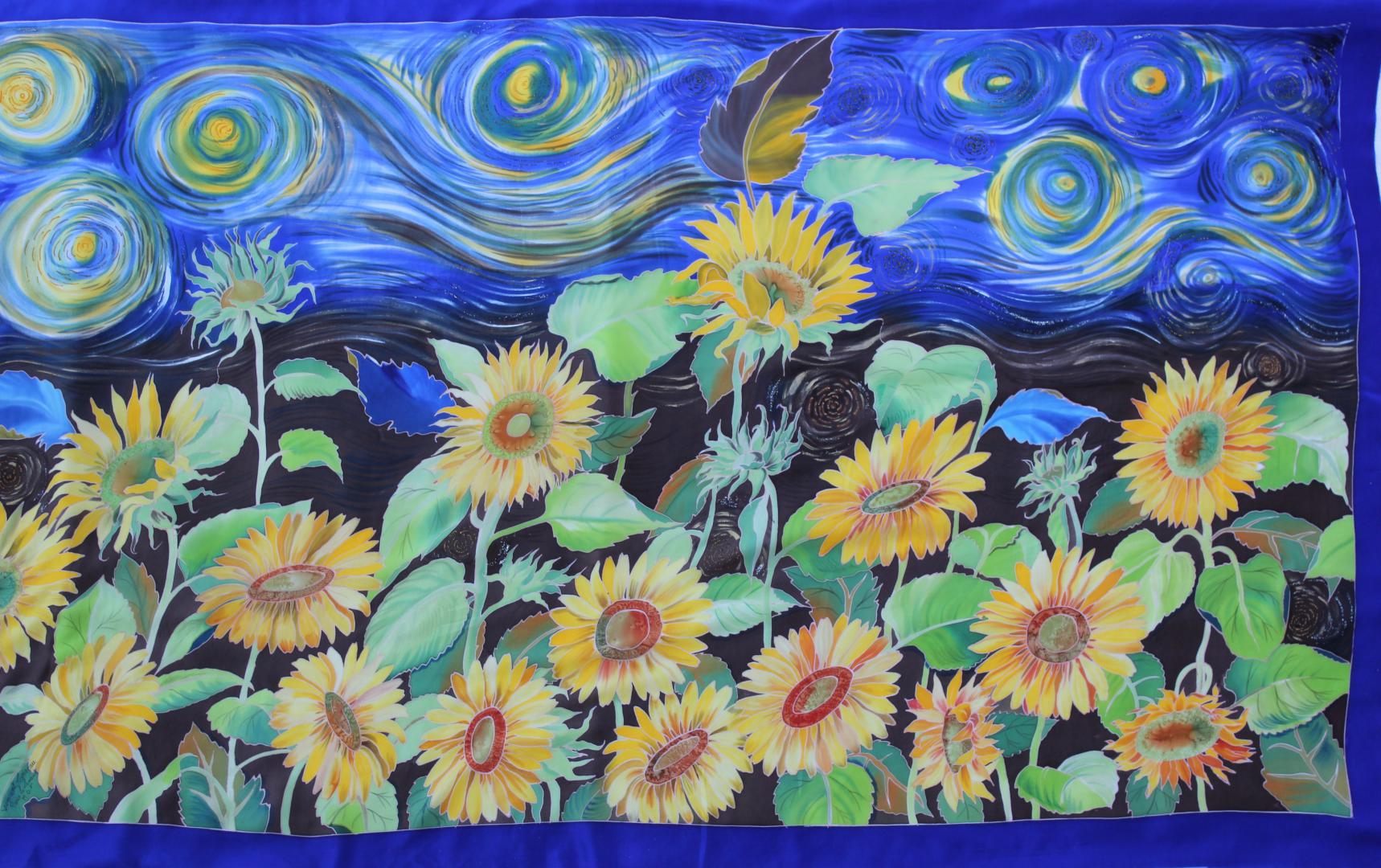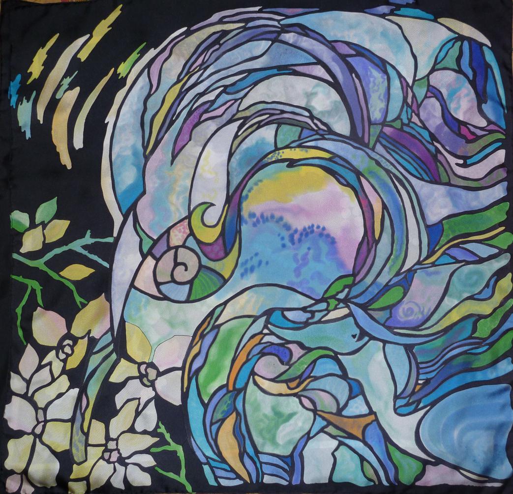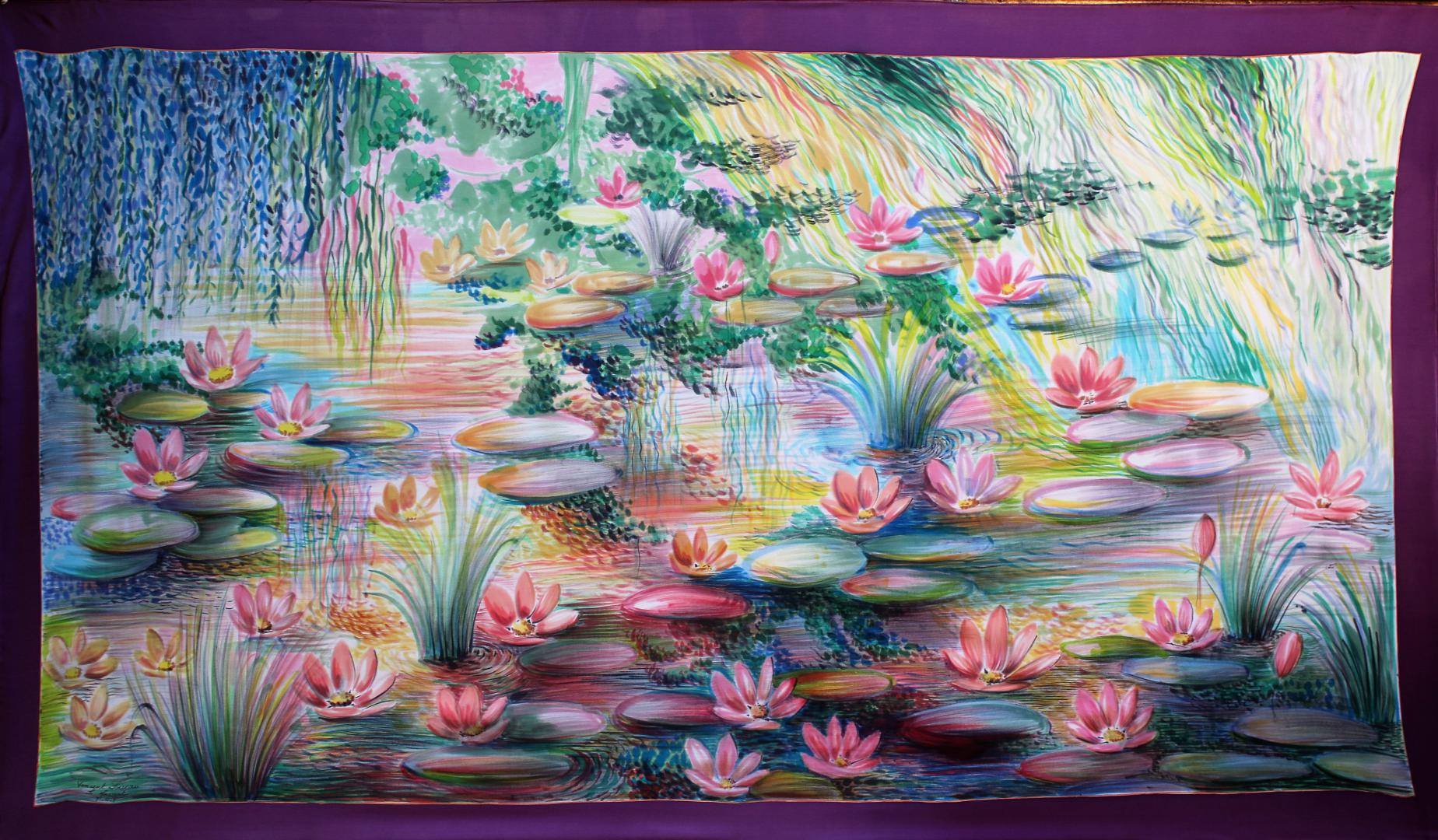 Les motifs sont dessinés à la gutta (sorte de caoutchouc liquide) du premier jet à main levée sur la soie tendue. L'exercice ne tolère aucun repentir.