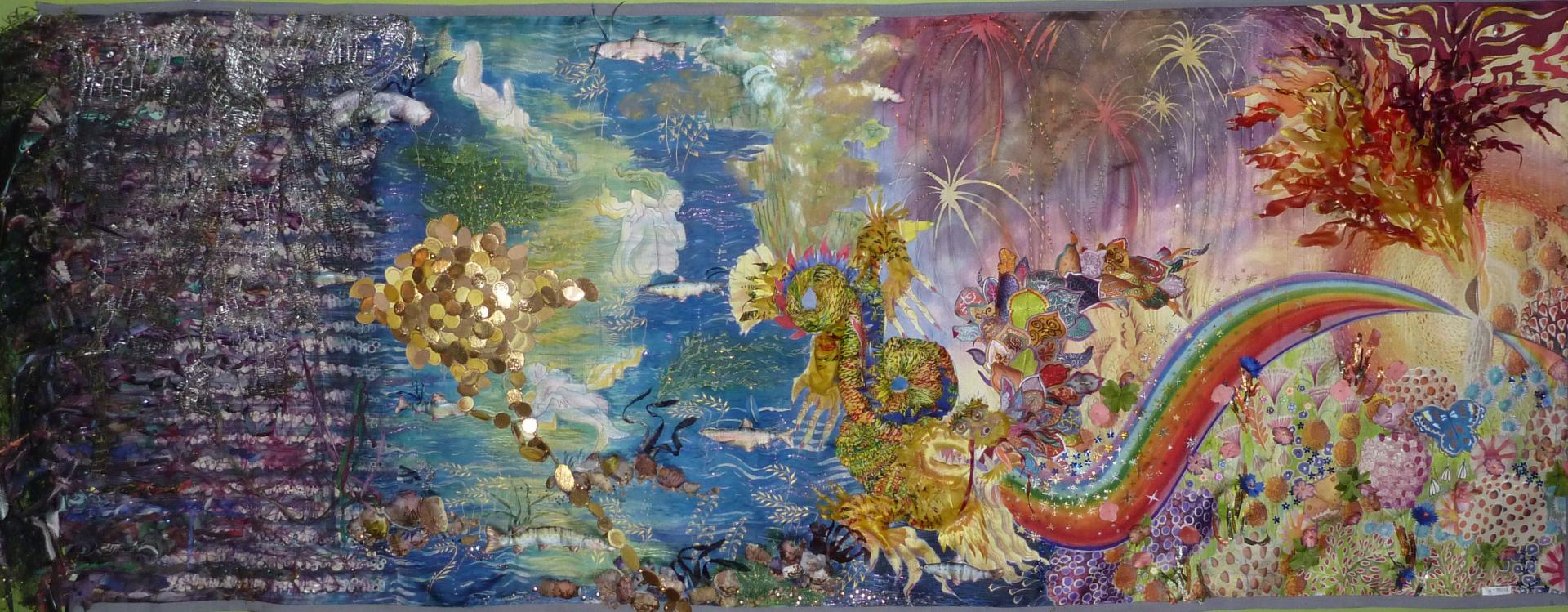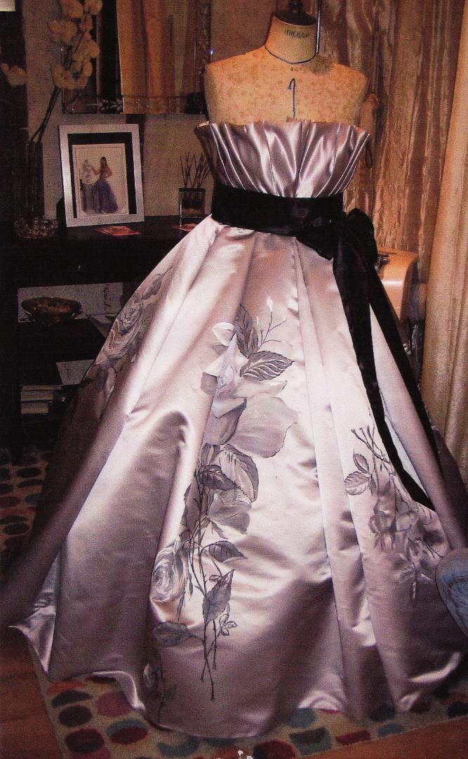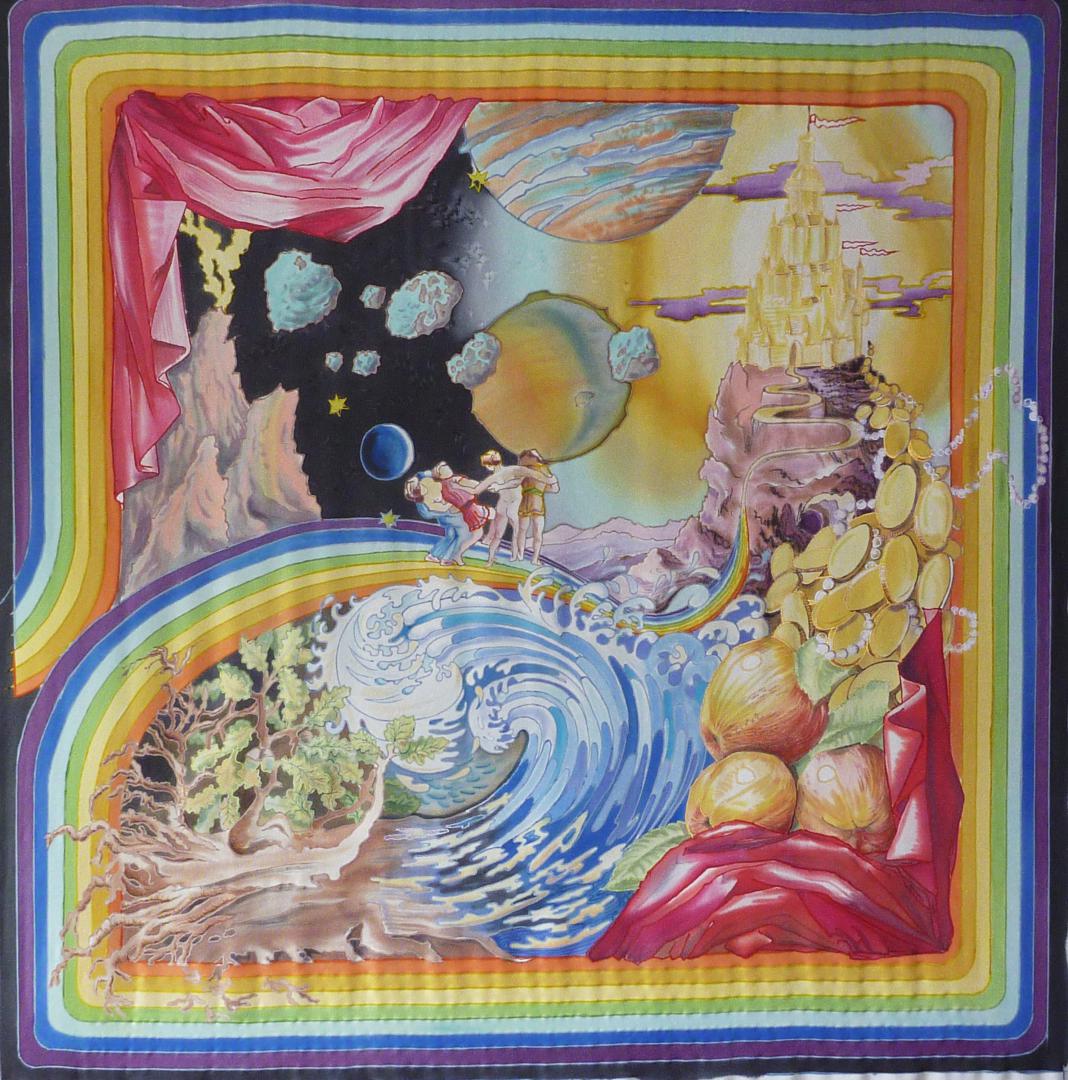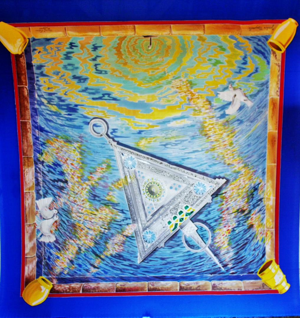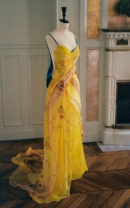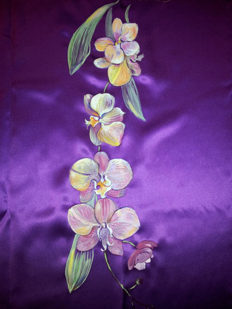 Les motifs sont dessinés à la gutta (sorte de caoutchouc liquide) du premier jet à main levée sur la soie tendue. L'exercice ne tolère aucun repentir.